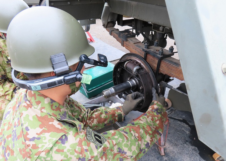 現地に派遣された若年隊員がボディカメラを装着し、遠隔地のベテラン隊員(上位技術者)がリアルタイムで現場の様子を確認しながら、整備作業の細部を指導・助言する運用を実現できるよう研究。